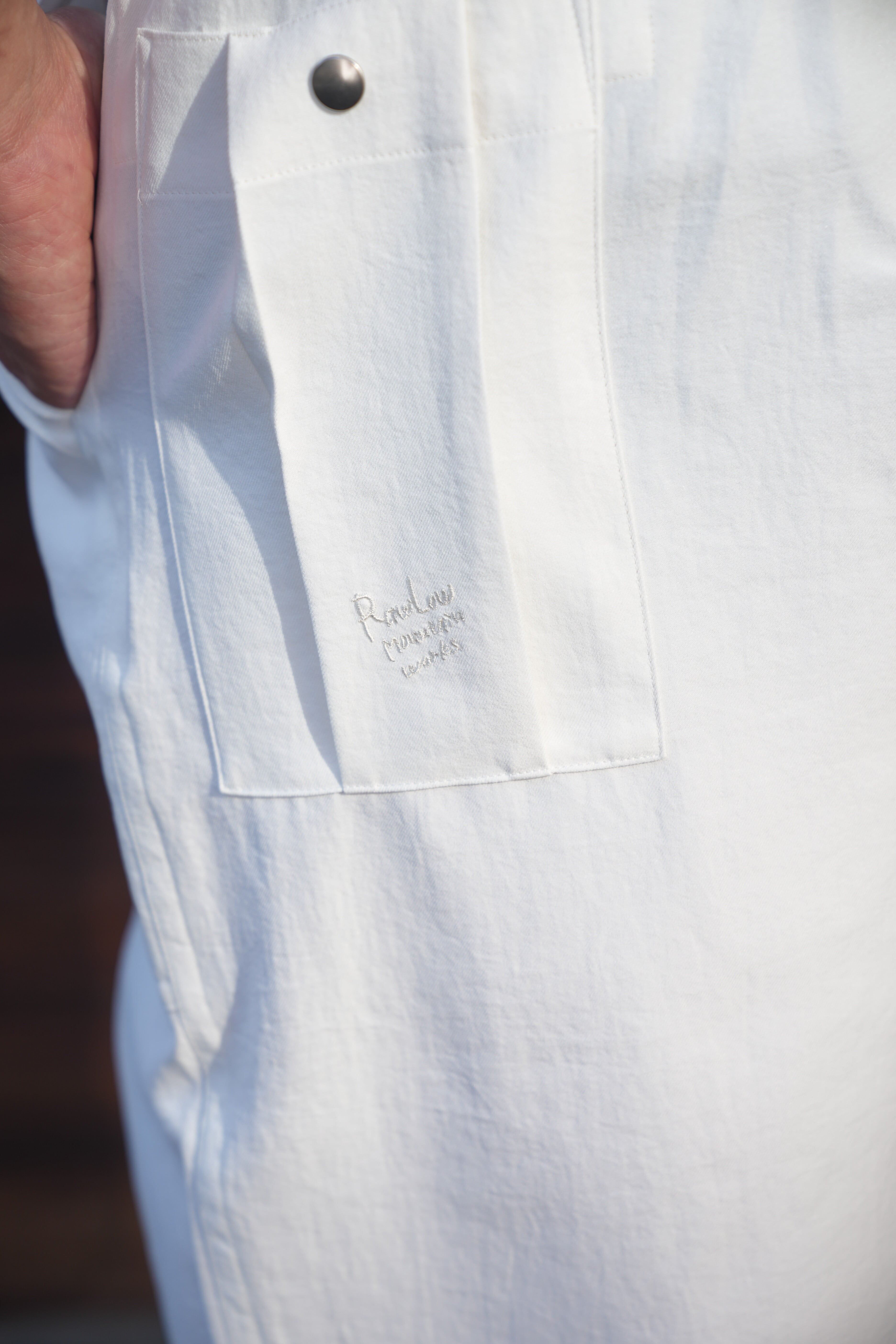 また深めの股上と股下のガセットによって足捌きも良くテーラードのテクニックでもある立体的なフロントファスナーの取り付けによって生地がもたつく感じもありません。ベルトのゴム幅も太めに取ることで骨盤に広範囲に優しく乗るようにし長時間履いても腰にかかる負担を極力軽減しつつ動いても下がりにくい設計になっています。
