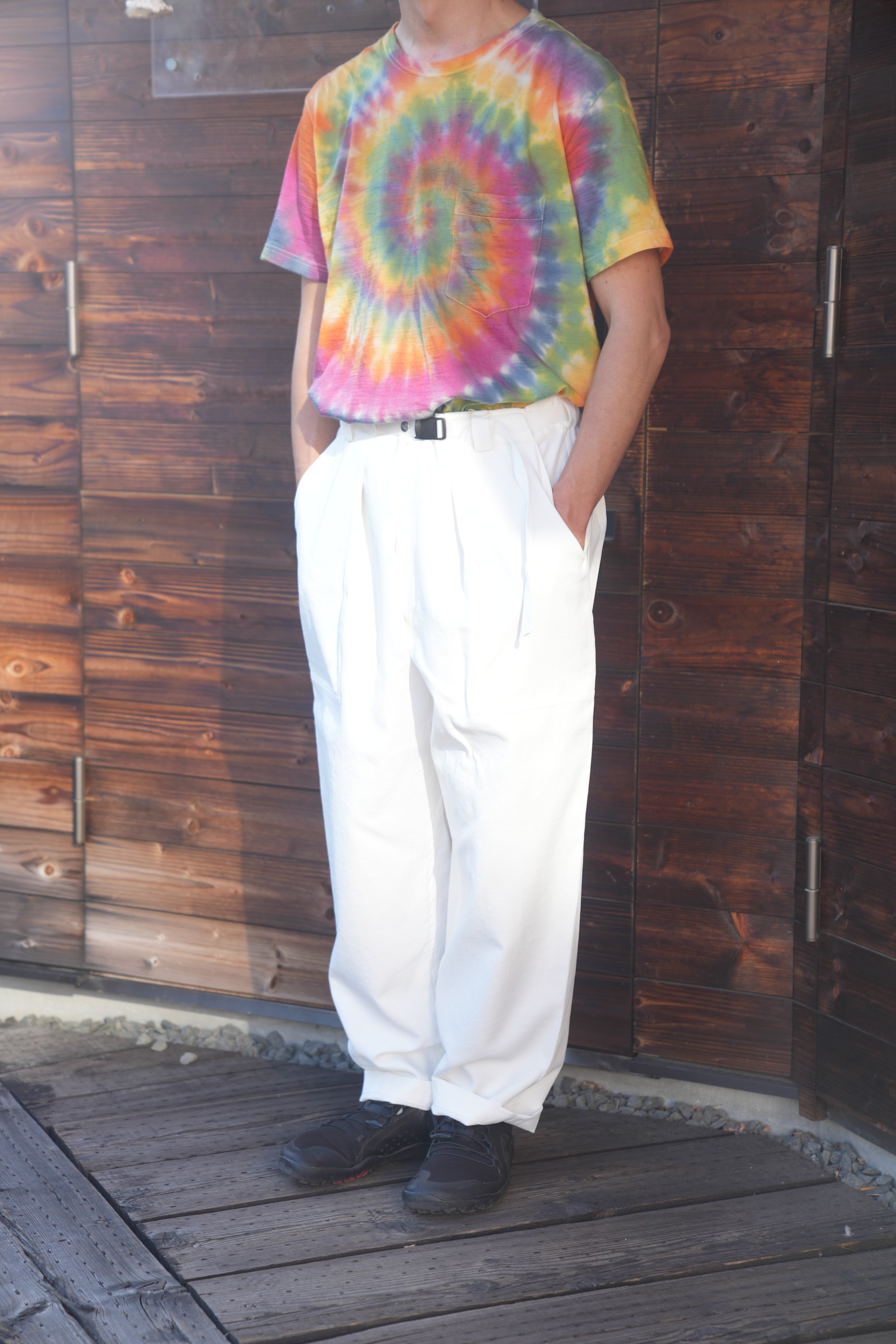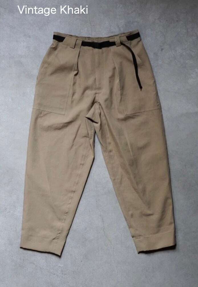 ベイカーパンツの特徴的なフロントパッチポケットはややもすると野暮ったくなりがちですが深いタックを配することでドレープが綺麗に出て上品な雰囲気になりました全体的なシルエットはワタリがかなり太めで裾に向かって綺麗にテーパーしていくバルーンシルエット、様々な体型の方にリラックスフィットするパターンです。