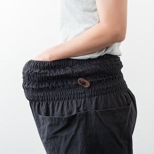 ウエストの細い方や、モンペズボンの大きなポケットに重量のある荷物を入れるような場合はコードゴムを引き締めることでズボンのずり下がりを防ぎます。