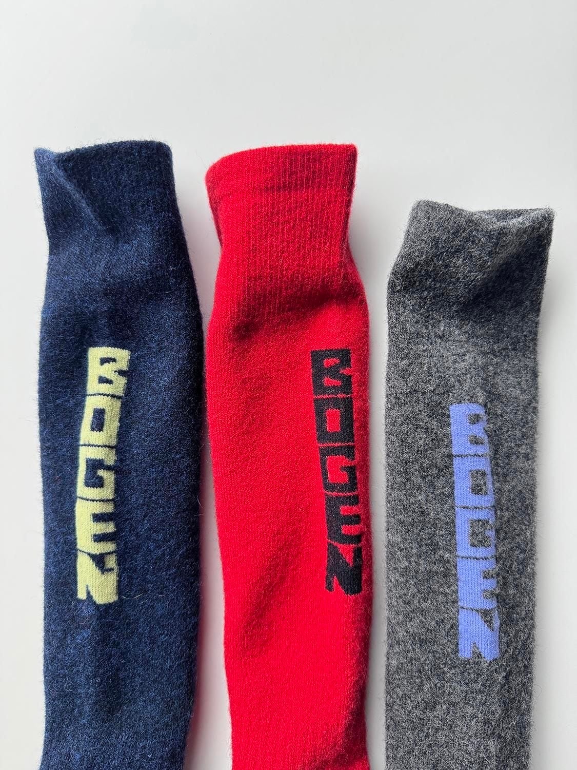 くるぶし上で切り替えて、ふくらはぎにブロック型文字を編み込んだ。
