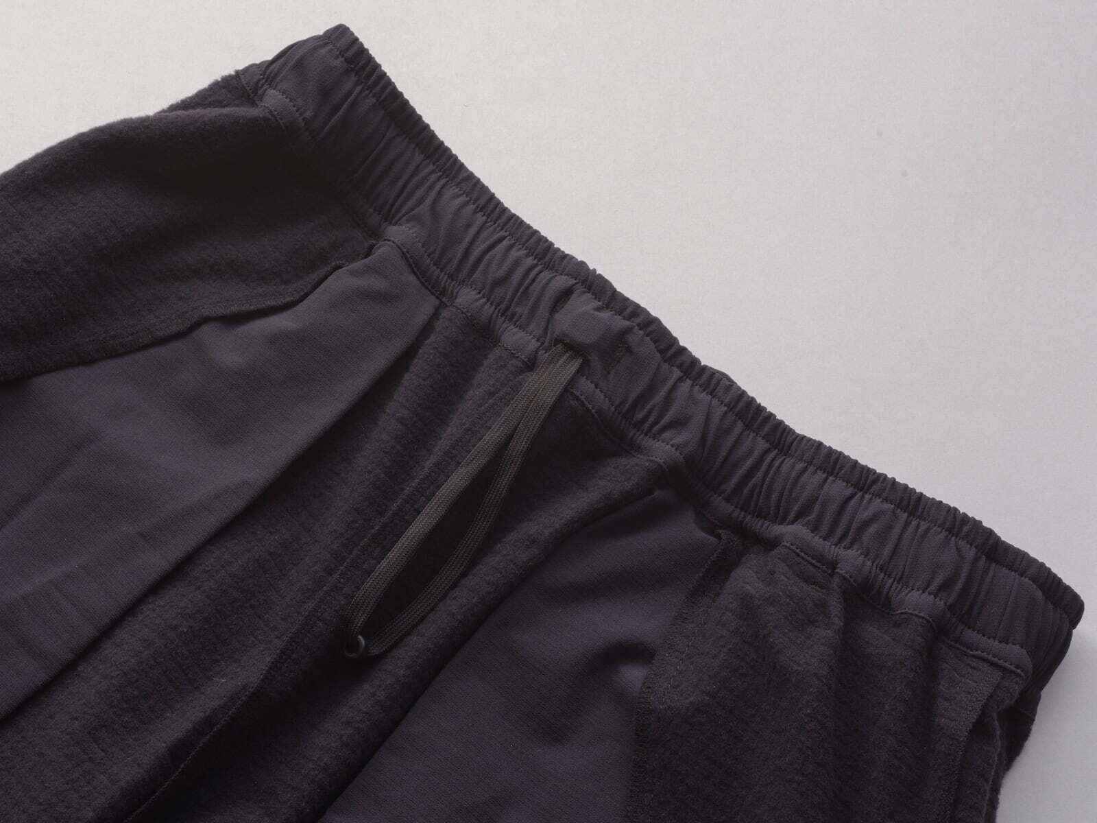 紐を引けばウエストが絞られて、ゴム中央の内側に隠されたパーツを前に押し込むことで簡単に緩めることができます。