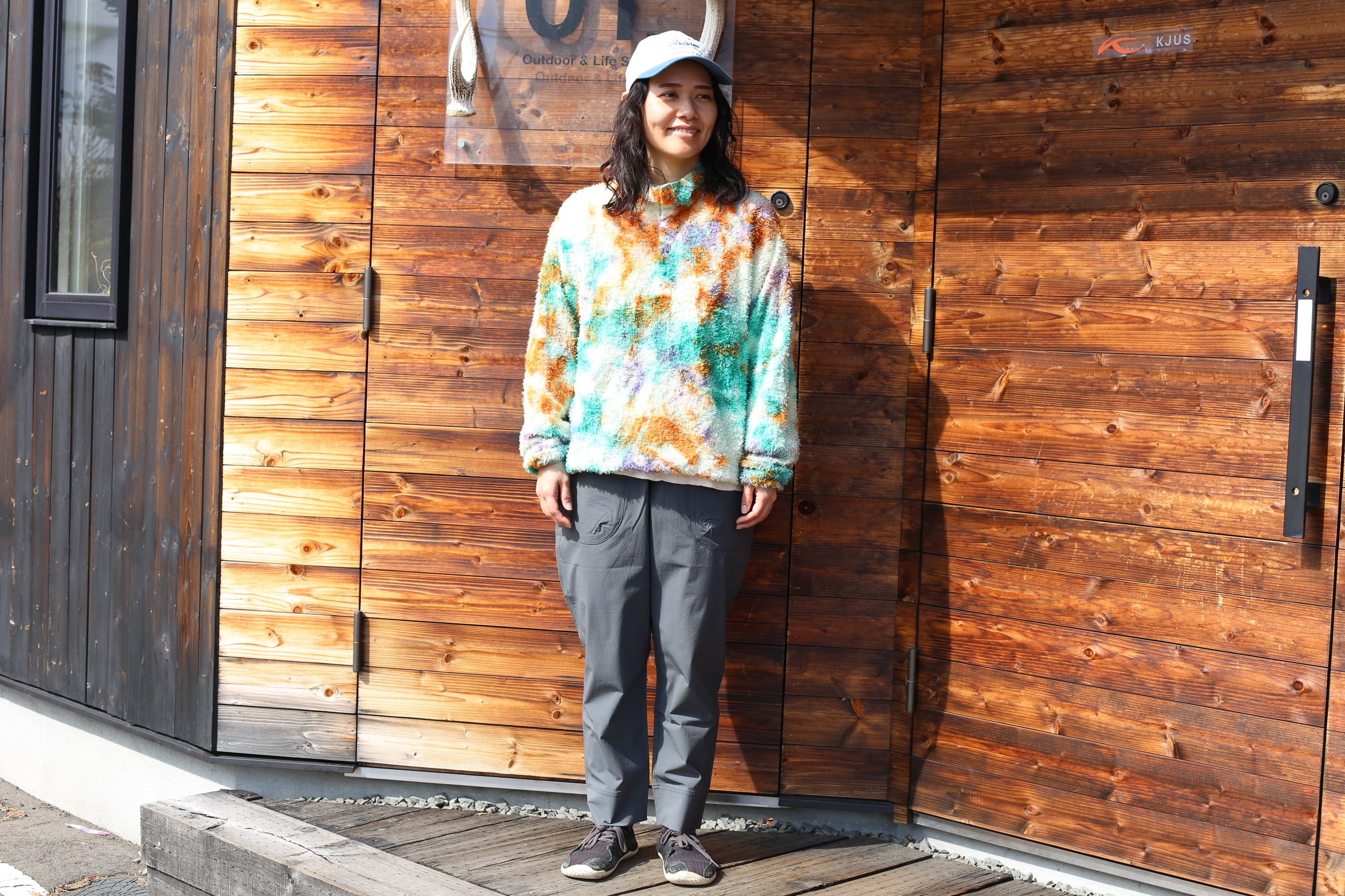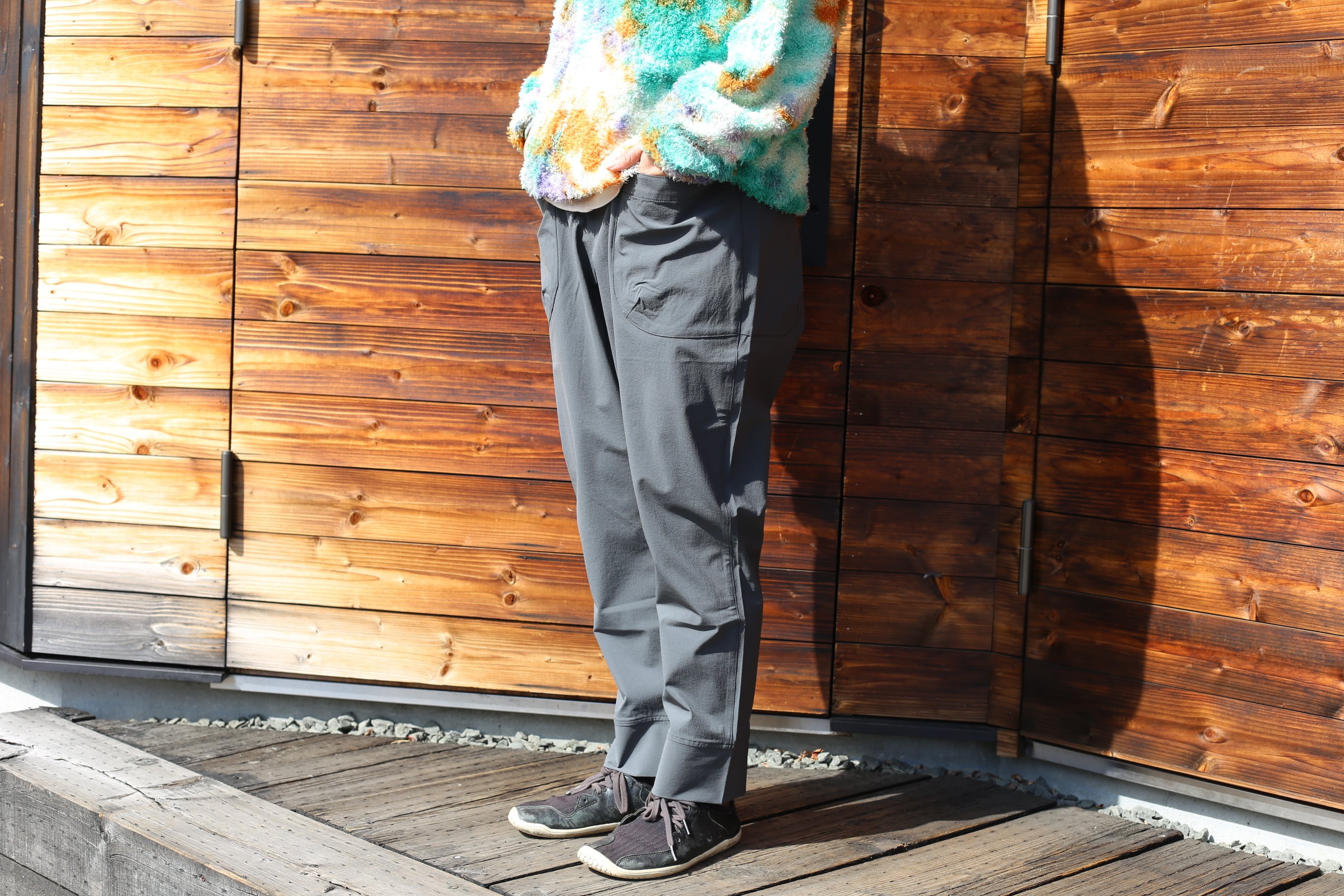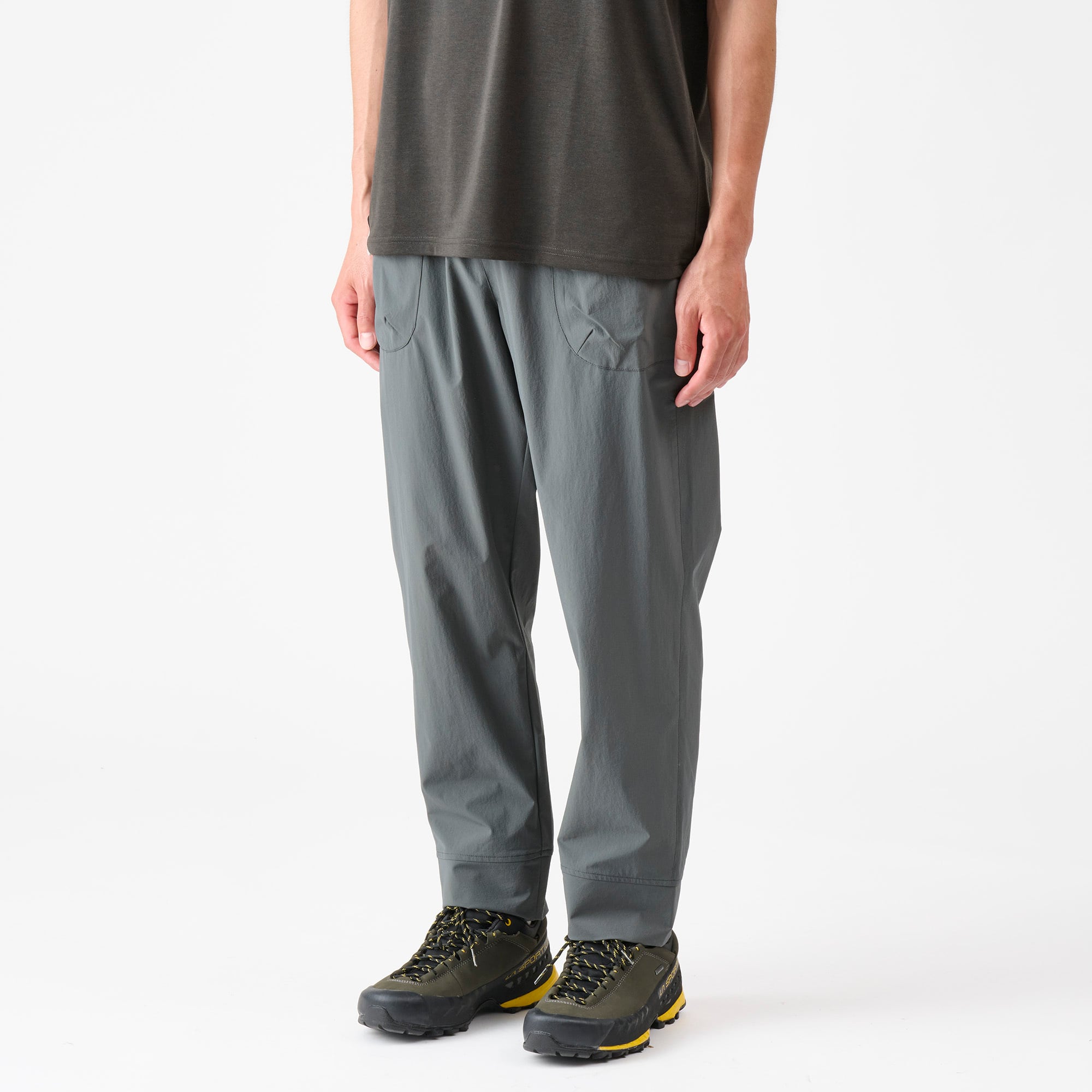 素材にストレッチ性があるので膝を立体にしなくても充分に動きやすく、長い石段や段差の多いルートにもストレスを感じません。
