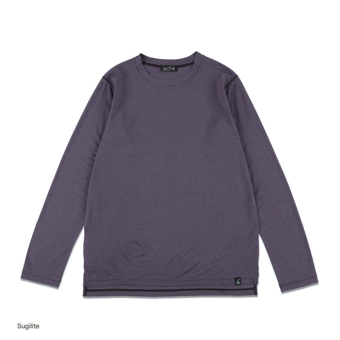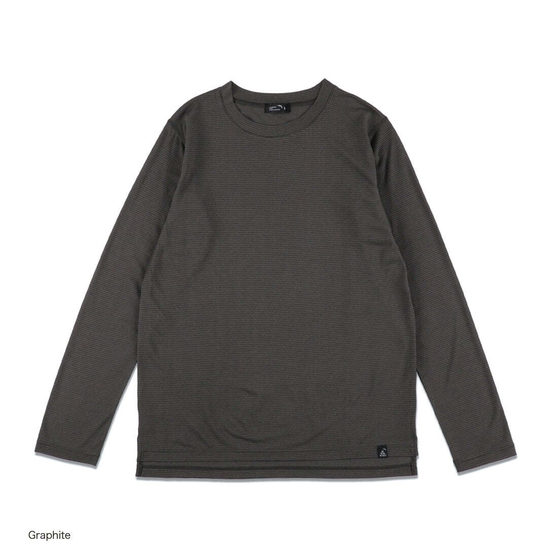 凹凸のあるボーダーメッシュ構造により高い通気性とリサイクルポリエステル糸で速乾性を高めます。 ウインドシェルを羽織ればさらに保温性が高まるため、インナーとしてもそれ単体でも活躍するアイテムです。